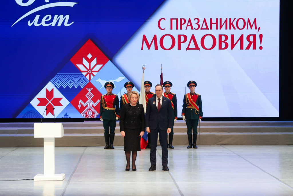 Спикер Совета Федерации отметила вклад народа Мордовии в защиту и развитие страны, а также достижения сегодняшнего дня: выполнение гособоронзаказа, развитие инновационного производства и интеллектуальной собственности, формирование благоприятного инвестиционного климата, реализацию проектов в промышленности и сельском хозяйстве.