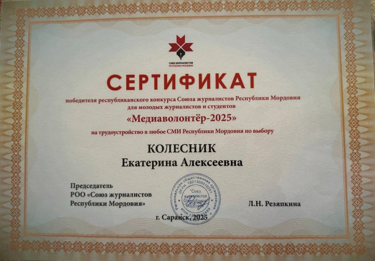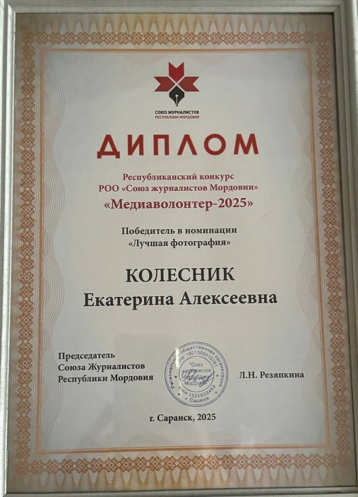 Юная журналистка Екатерина Колесник, студентка 3 курса филологического факультета МГУ им. Н.П. Огарева, стала победителем Республиканского журналистского конкурса Союза журналистов Республики Мордовия для молодых журналистов и студентов Республики Мордовия «Медиаволонтер/Медианаставник - 2025» в номинации «Лучшая фотография».