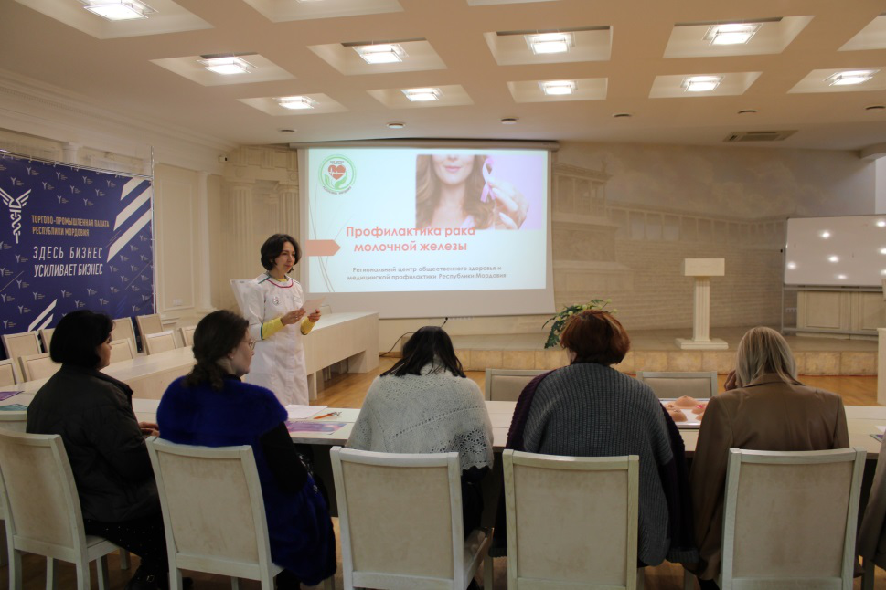 16 октября сотрудники Регионального Центра общественного здоровья и медицинской профилактики (РЦОЗиМП) посетили Союз "Торгово-промышленная палата Республики Мордовия", реализующий корпоративную программу по укреплению здоровья сотрудников, где для работников организации было проведено мероприятие "Профилактика рака молочных желез".